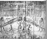 The deities depicted on the walls, besides Amun-re, are Sobek in the form of a crocodile, the ram-headed god Khnum of the First Cataract, Satet of Elephantine, Anuket, goddess of Sehel, Tauret as a hippopotamus and Hapi, god of the Nile. As well as those of Horemheb, cartouches of Rameses II, Merenptah, Amenemesse, Seti II, Siptah and Rameses III appear in the reliefs.