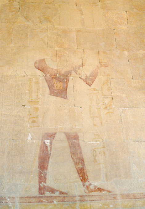| The following registers already show the arrival and the unloading of the ships at Thebes in presence of Hatshepsut. Since there was no connection from the Red Sea to the Nile, it is remains questionable, how the ships reached Thebes. Possibly, they were dismantled at the Red Sea port and transported on a desert road to the Nile (both on the way there on back?): On the other hand the relief shows perhaps only the ships which brought the treasures on the Nile from Coptos to Thebes. In the papyrus Harris I dated into the time of Ramses III (20. Dynasty) is reported, how, the goods were reloaded on carriers and donkeys, loaded again on ships at Coptos with which they were then transported down the Nile (in this case the destination cannot have been Thebes). The most valuable part of the goods brought along Hatshepsut, in presence of Nehesj and Senenmut standing beside him, offered proudly to her "father" Amun. The figures of Hatshepsut, Nehesj and Senenmut as well as an important part of the texts were already chiseled out in antiquity. Now Thutmosis III wearing the Khepresch crown appears in front of Amun offering two jars of myrrh (see photo below). These changes were probably part of the usurpation by Thutmosis III. |